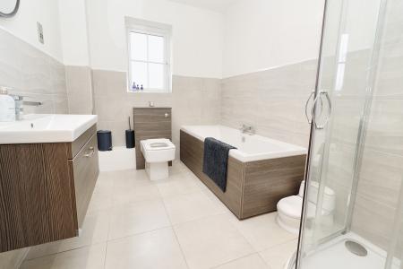 FAMILY BATHROOM Fitted with a four piece comprising of panelled bath, shower cubicle, wash hand basin in a vanity style unit and close coupled WC, partly tiled walls, tiled flooring, chrome towel radiator, shaver point, spotlights and double glazed window to the rear aspect.