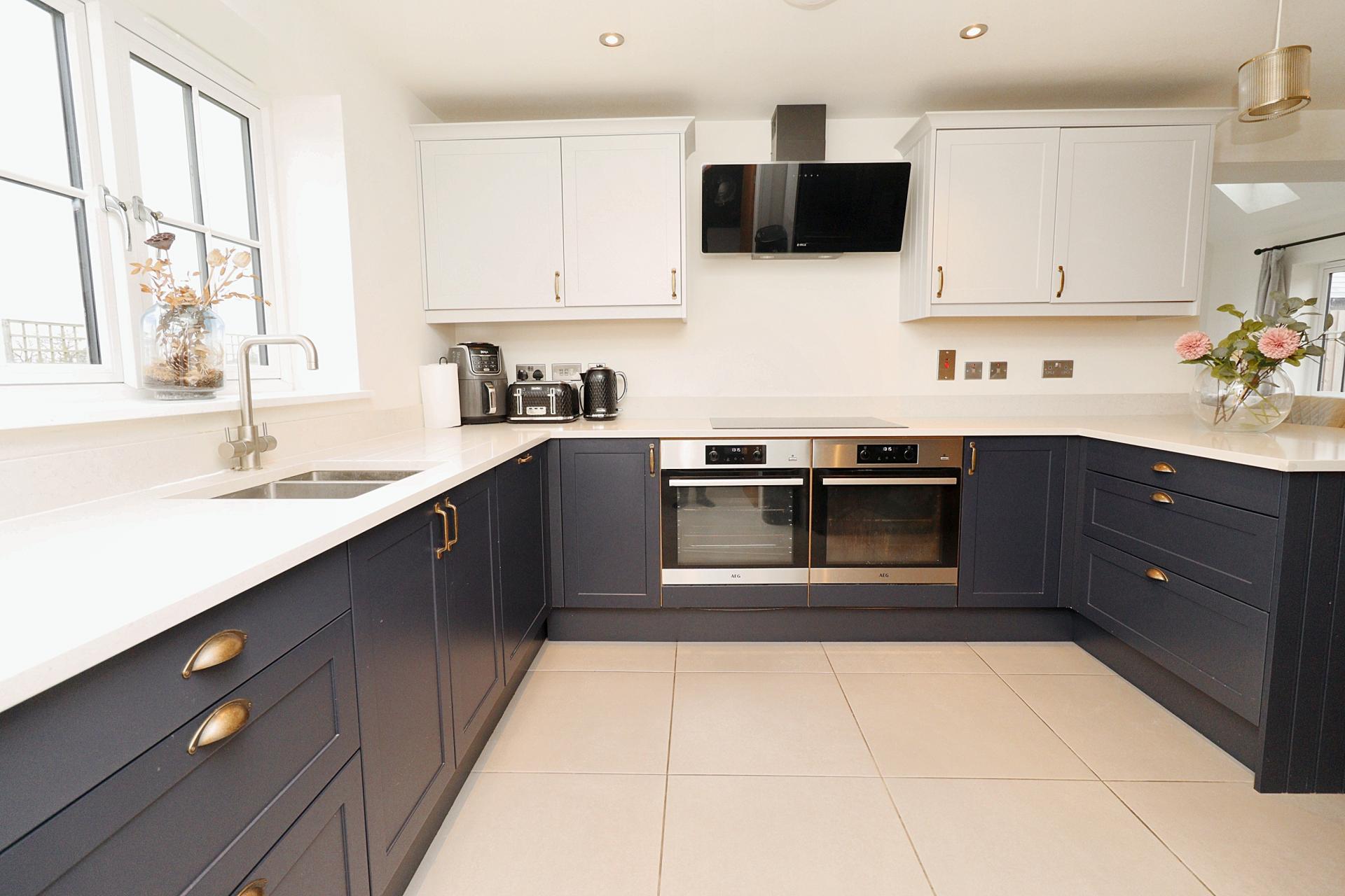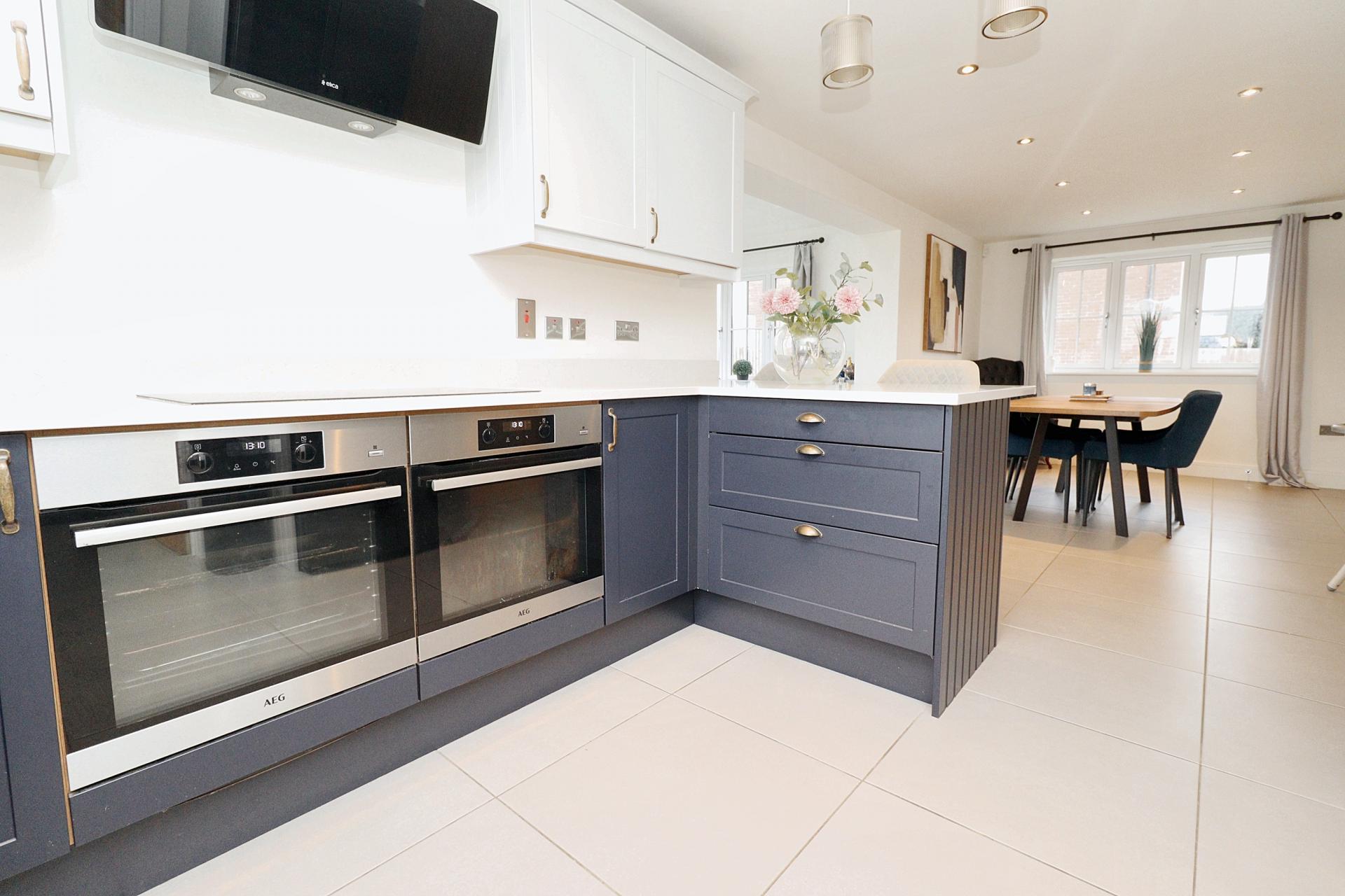KITCHEN/DINER 26' 11" x 9' 9" (8.21m x 2.99m) Fitted with a stylish range of wall and base units with Quartz work surfaces, stainless steel under mount 1 1/2 bowl sink unit with side drainer and mixer tap over, integrated dishwasher, twin electric ovens, induction hob with extractor fan over, space for American fridge freezer, breakfast bar, double glazed windows to the rear and front aspects, tiled flooring with underfloor heating and spotlights.