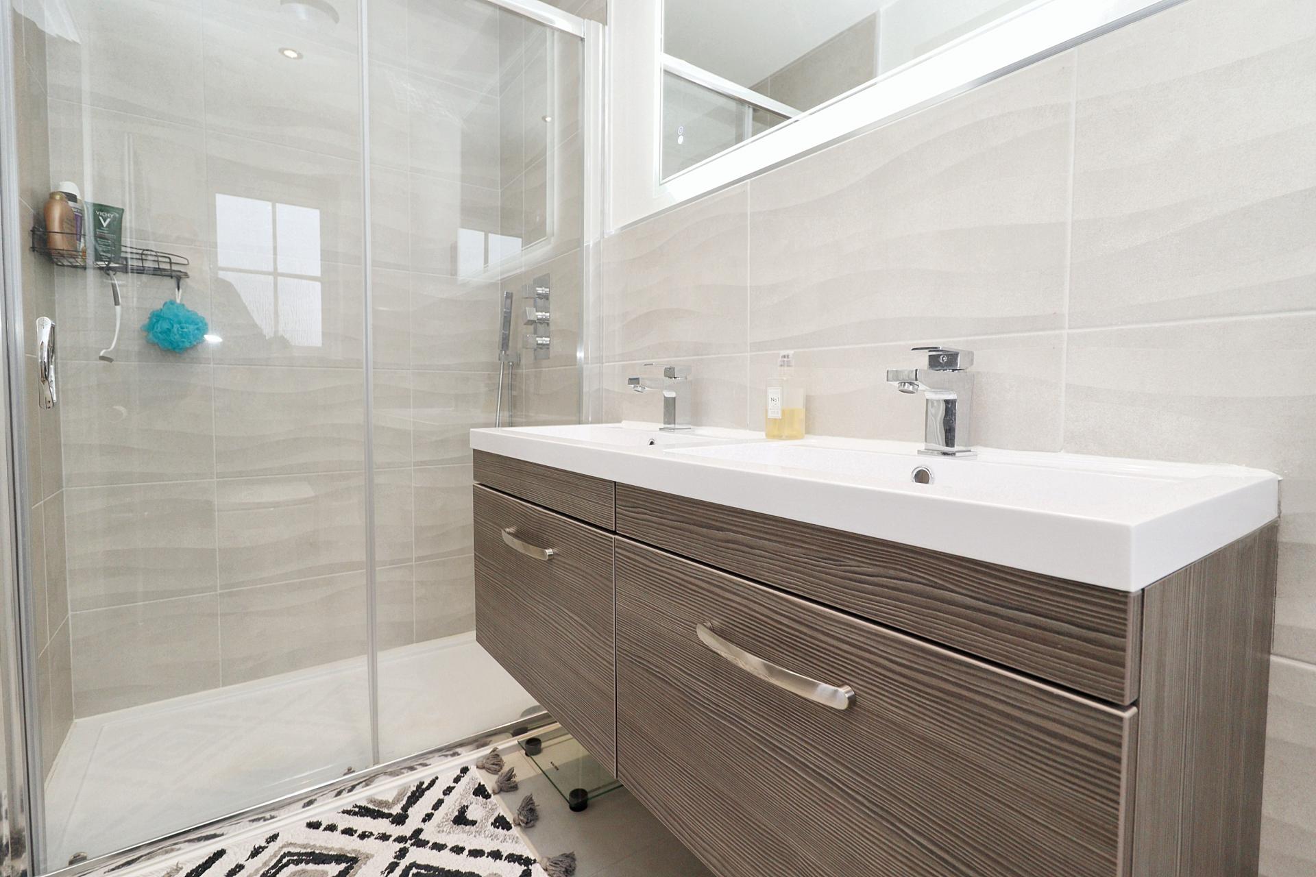 EN-SUITE SHOWER ROOM Fitted with a three piece suite comprising of shower cubicle, twin wash hand basins in a vanity unit and close coupled WC, partly tiled walls, tiled flooring, chrome towel radiator, spotlights, shaver point and double glazed window to the side aspect.
