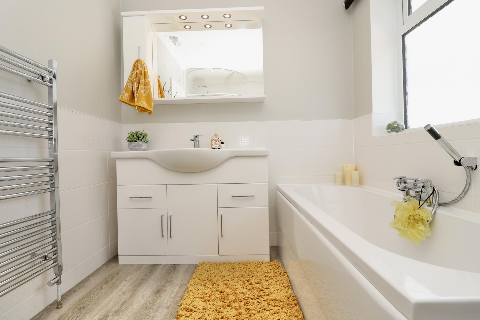 - Three well-sized bedrooms and a modern family bathroom with a walk-in shower and bath.