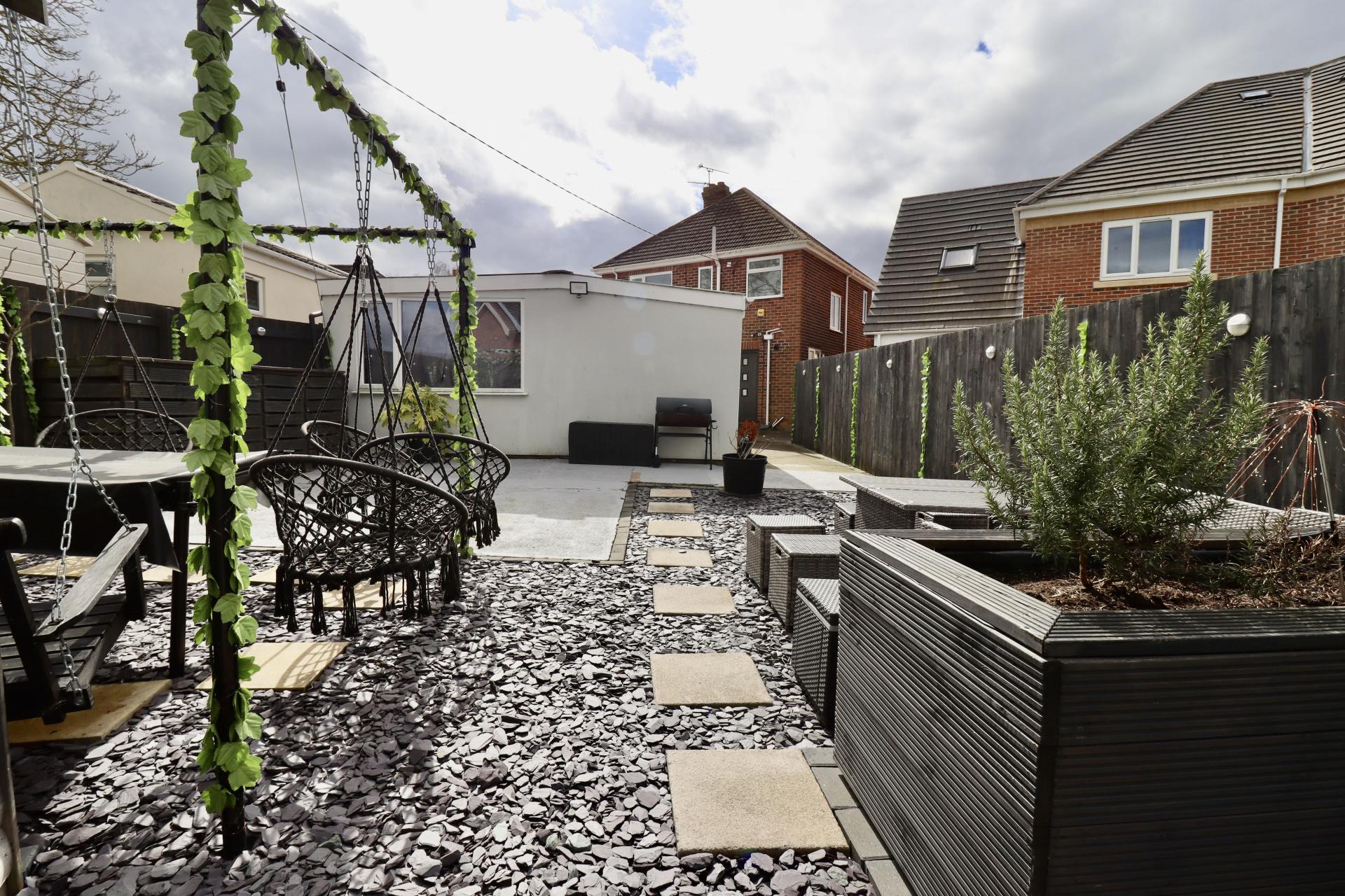 - Well-maintained front and rear gardens with seating areas, raised planters, and an outbuilding.