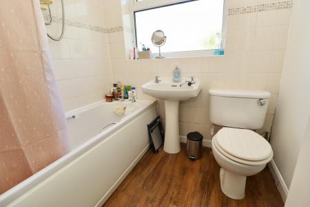 BATHROOM Fitted with a three piece suite comprising of panelled bath with electric shower over, pedestal wash hand basin and close coupled WC, tiled splashbacks, laminate flooring, chrome towel radiator and double glazed window to the rear aspect.