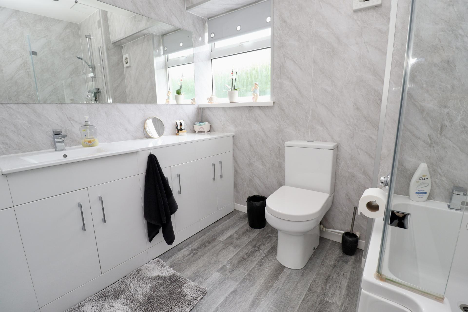 BATHROOM Fitted with a three piece suite comprising of P-shaped bath with shower over and glass shower screen, close coupled WC and wash hand basin in a vanity style unit, chrome towel radiator, spotlights and double glazed window to the side aspect.