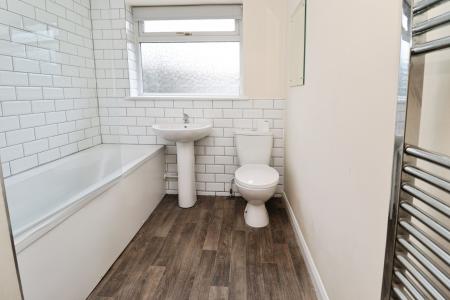 BATHROOM Fitted with a three piece suite comprising of panelled bath with electric shower over and glass shower screen, close coupled WC, pedestal wash hand basin, tiled splashback, chrome towel radiator, airing cupboard and double glazed window to the rear aspect.