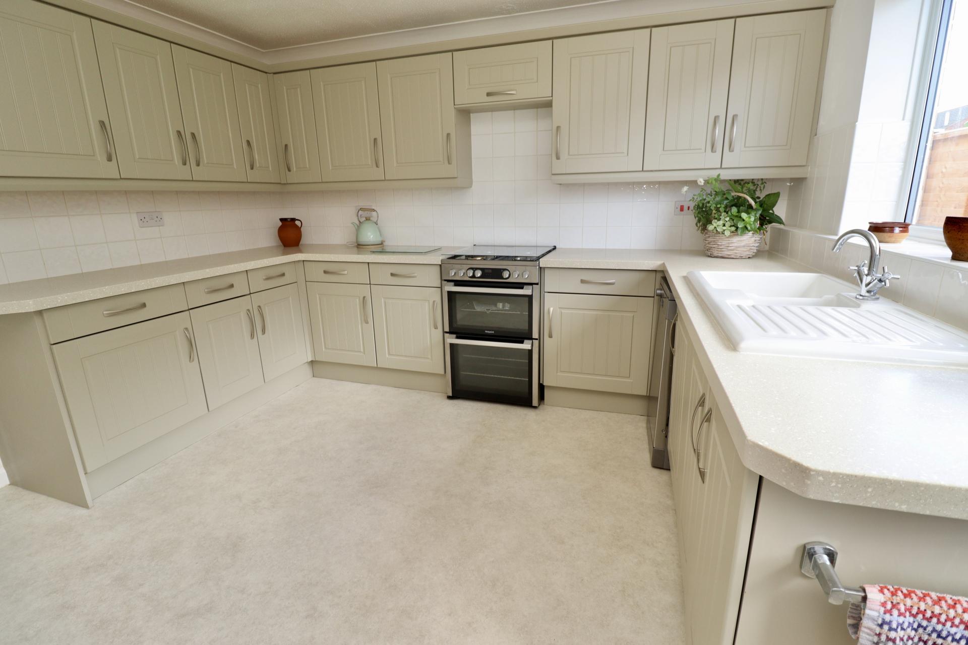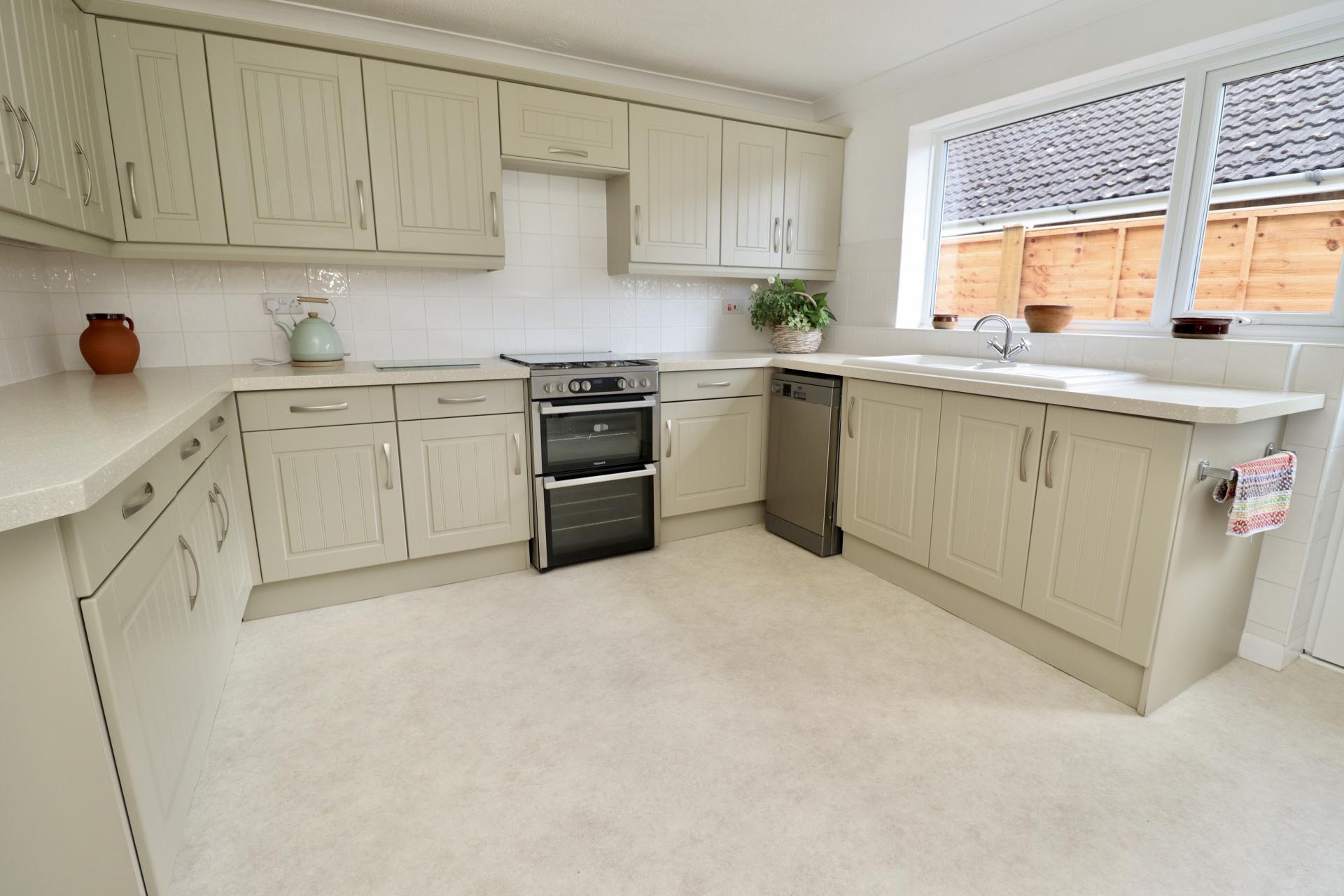 KITCHEN 11' 10" x 11' 9" (3.61m x 3.59m) Fitted with a stylish range of wall and base units with work surfaces over, ceramic 1 1/2 bowl sink with side drainer, spaces for cooker and slimline dishwasher, tiled splashbacks, radiator, double glazed window and door to the side aspect.