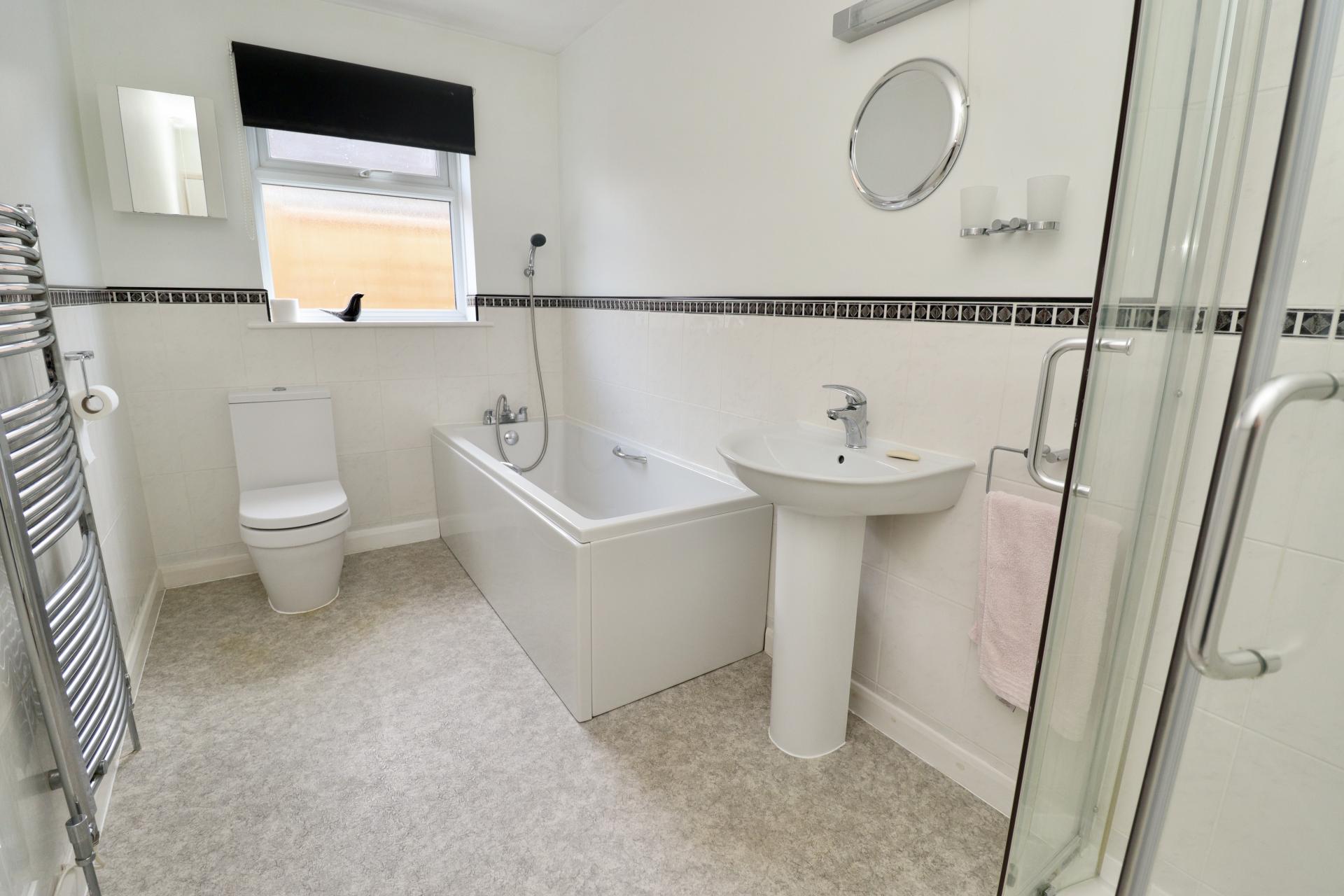 BATHROOM Fitted with a four piece suite comprising of panelled bath, shower cubicle, close coupled WC and pedestal wash hand basin, chrome towel radiator, part tiled walls and double glazed window to the side aspect.