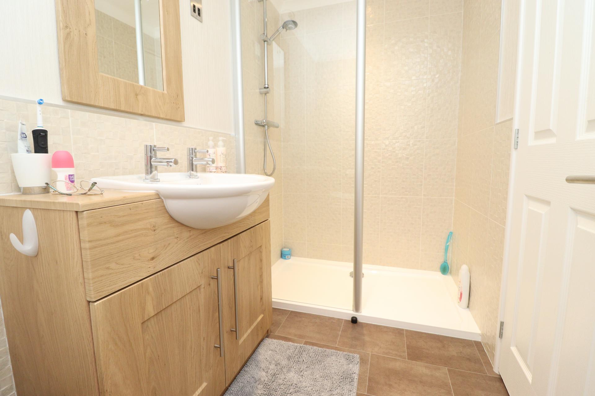 EN-SUITE SHOWER ROOM Fitted three piece suite comprising of walk-in shower cubicle, wash hand basin in a vanity unit and close coupled WC, tiled splashbacks and double glazed window to the front aspect.