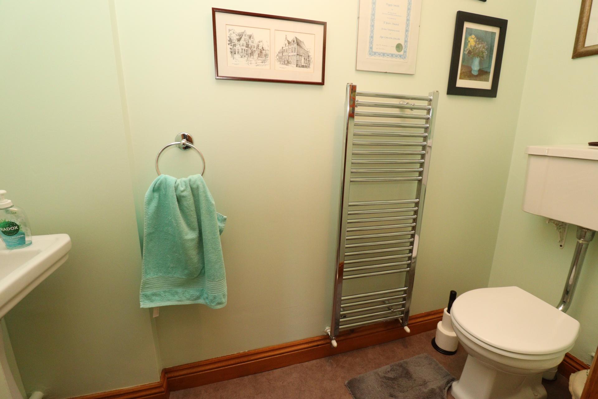 CLOAKROOM/WC With close coupled WC, pedestal wash hand basin, chrome towel radiator and tiled splashbacks.