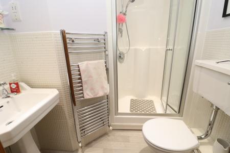 EN-SUITE SHOWER ROOM Fitted with a three piece suite comprising of a shower cubicle, wash hand basin and close coupled WC, part tiled walls, chrome towel radiator and spotlights.
