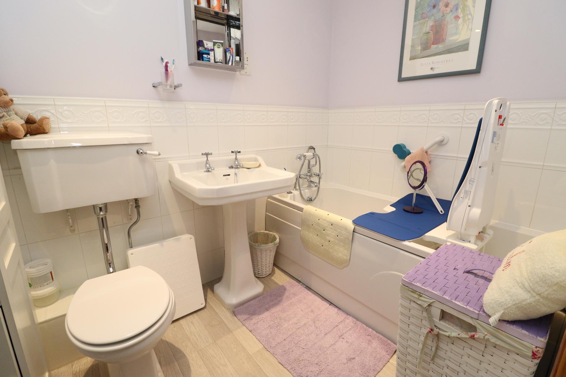BATHROOM Fitted with a three piece suite comprising of a panelled bath, pedestal wash hand basin and close coupled WC, part tiled walls, chrome towel radiator and spotlights.
