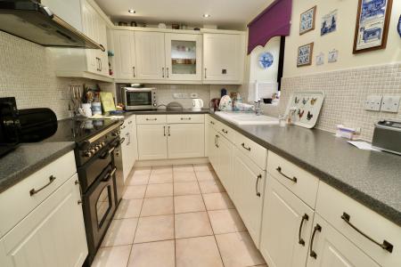 KITCHEN 11' 5" x 7' 8" (3.50m x 2.35m) Fitted with a range of wall and base units with work surfaces over, ceramic 1 1/2 bowl sink with side drainer and mixer tap over, integrated fridge freezer and washing machine, range cooker with extractor fan over, cupboard housing the gas fired central heating boiler, tiled flooring and splashbacks and double glazed window to the rear aspect.