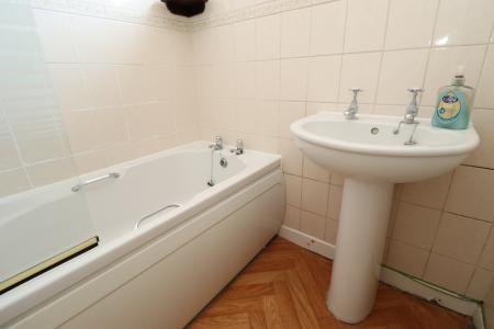 BATHROOM 5' 4" x 5' 4" (1.64m x 1.63m) With UPVC window to the side aspect, bath with shower over, wash hand basin, radiator and fully tiled walls.