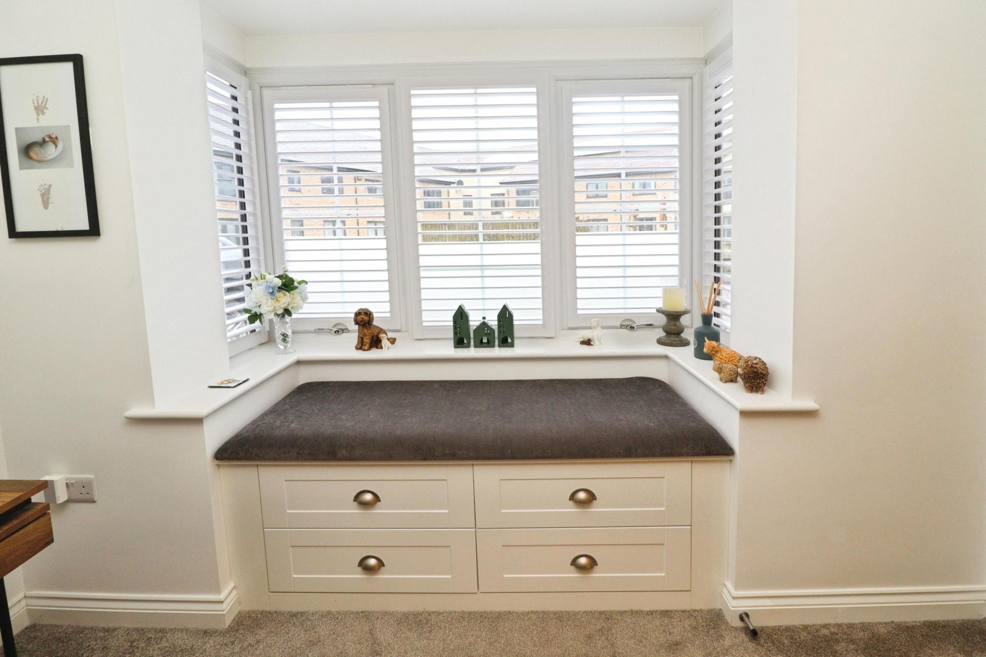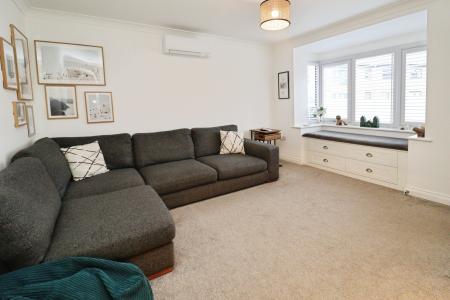 LOUNGE 12' 10" x 12' 7" (3.92m x 3.85m) With double glazed bay window with wooden shutters and built-in window seat with storage beneath to the front aspect, air conditioning unit, under stairs storage cupboard and radiator.