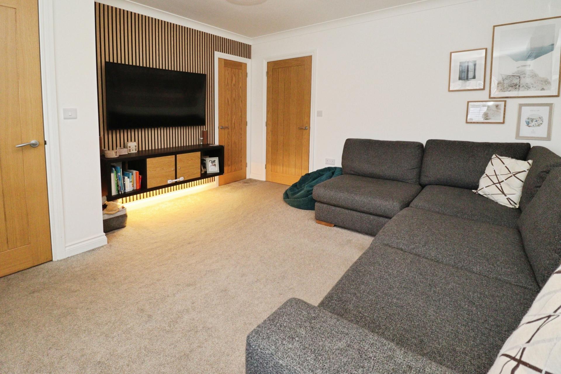 OUTSIDE To the front of the property there is a lawned garden, a block paved driveway with electric vehicle charge point, providing off street parking and access to the single garage. The garage has an up and over door to the front, side personnel door, light and power. To the rear of the property there is a generous enclosed garden laid mainly to lawn with a patio seating area.