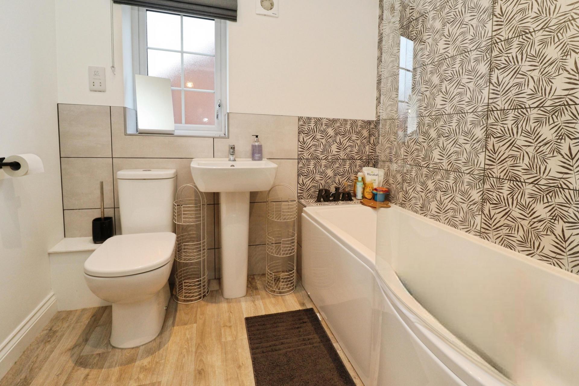 BATHROOM Fitted with a three piece suite comprising of panelled bath with shower over and glass shower screen, close coupled WC and pedestal wash hand basin, tiled splashbacks, laminate flooring, spotlights, towel radiator and double glazed window to the side aspect.