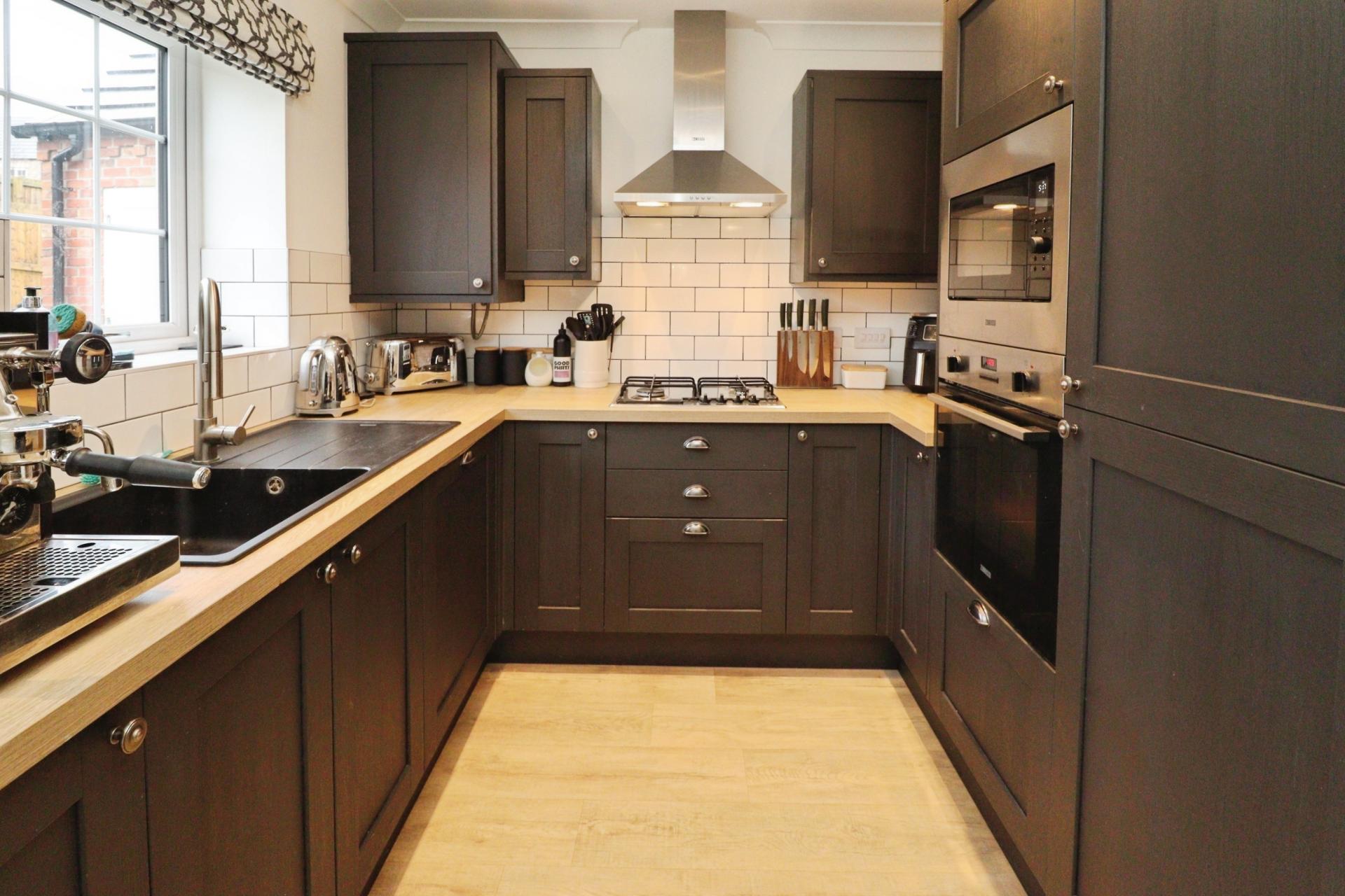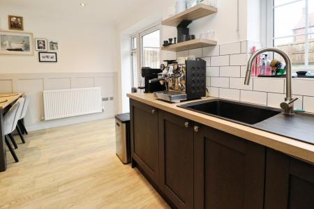 KITCHEN/DINER 15' 10" x 13' 5" (4.85m x 4.09m) Fitted with a stylish range of wall and base units with work surfaces over, sink unit with side drainer and mixer tap over, integrated appliances to include washing machine, fridge freezer, dishwasher, eye level electric oven, microwave and gas hob with extractor fan over, wall mounted gas fired central heating boiler, tiled splashbacks, laminate flooring, spotlights, under cabinet lights, radiator, double glazed window to the rear aspect and door to the garden.