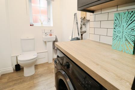 LOOTILITY 7' 3" x 5' 0" (2.21m x 1.53m) With close coupled WC, pedestal wash hand basin, wall cupboards, space for tumble dryer, tiled splashbacks, laminate flooring, radiator and double glazed window to the side aspect.