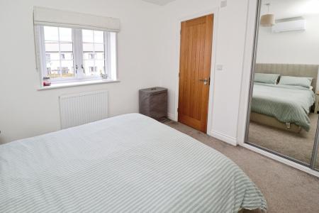 BEDROOM 1 14' 1" x 10' 4" (4.30m x 3.17m) With double glazed window to the front aspect, double wardrobe with mirror fronted sliding doors, air conditioning unit and radiator.