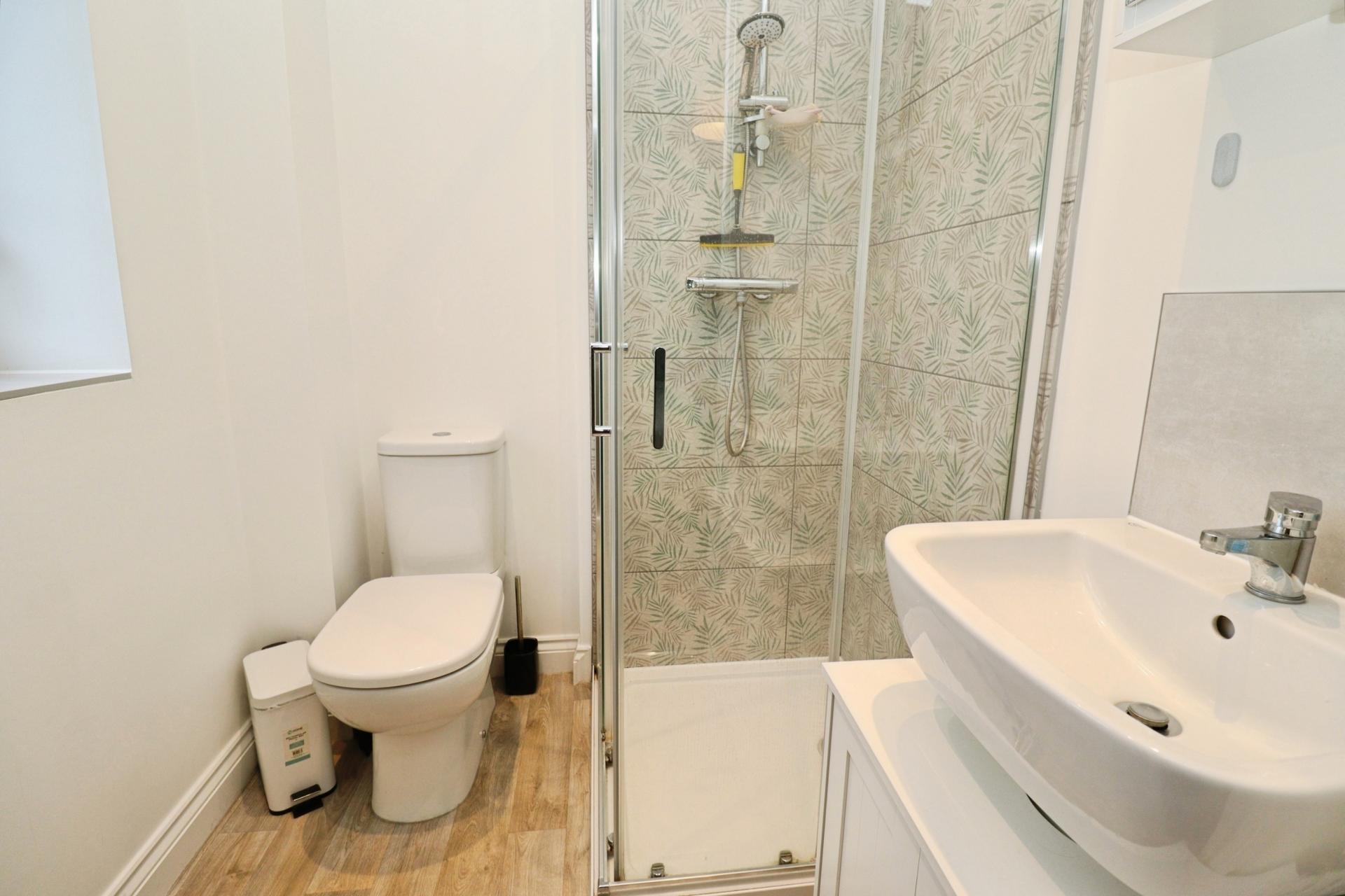 EN SUITE SHOWER ROOM Fitted with a three piece suite comprising of shower cubicle, close coupled WC and pedestal wash hand basin, tiled splashbacks, laminate flooring, spotlights, towel radiator and double glazed window to the front aspect.