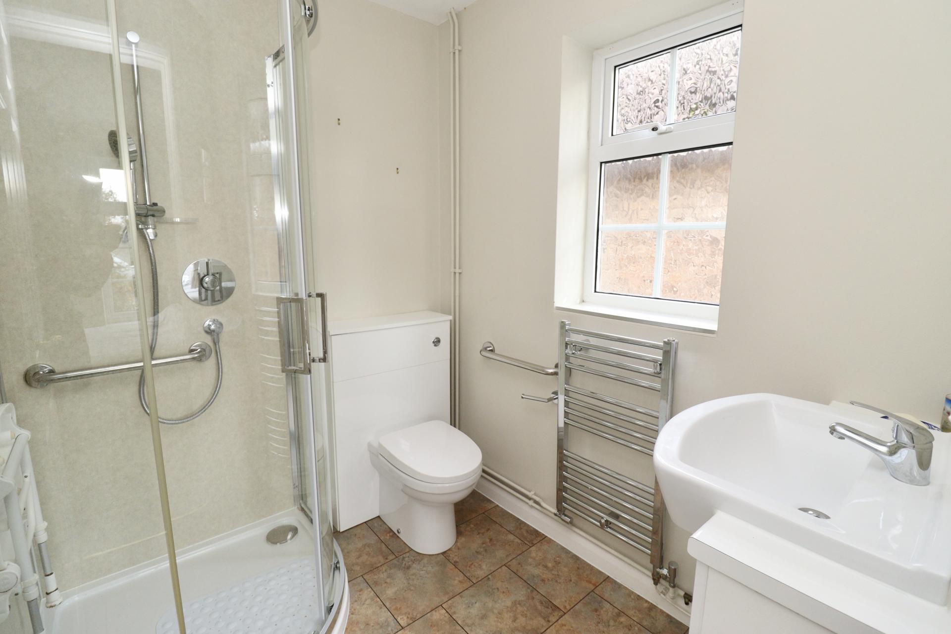 EN-SUITE SHOWER ROOM Fitted with a three piece suite comprising of shower cubicle, close coupled WC and wash hand basin in a vanity style unit, chrome towel radiator, tiled flooring, spotlights and double glazed window to the side aspect.