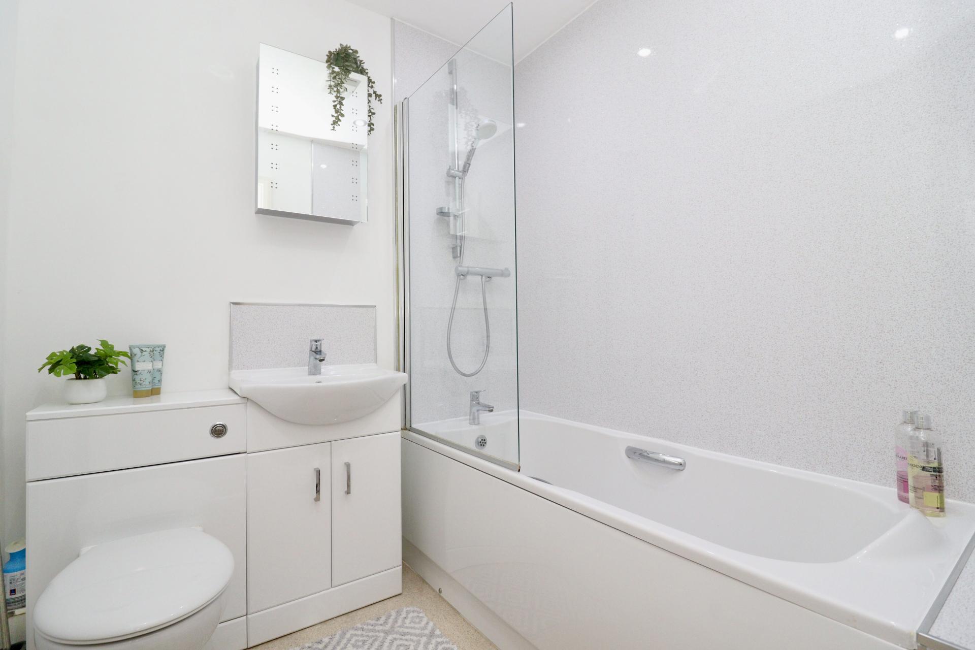 BATHROOM 6' 0" x 6' 3" (1.84m x 1.92m) Fitted with a three piece suite comprising of panelled bath with shower over and glass shower screen, close coupled WC and wash hand basin in a vanity style unit, spotlights and radiator.