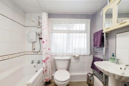 BATHROOM Fitted with a three piece suite comprising of panelled bath with shower, close coupled WC and pedestal wash hand basin, tiled splashbacks, chrome towel radiator and double glazed window to the side aspect.