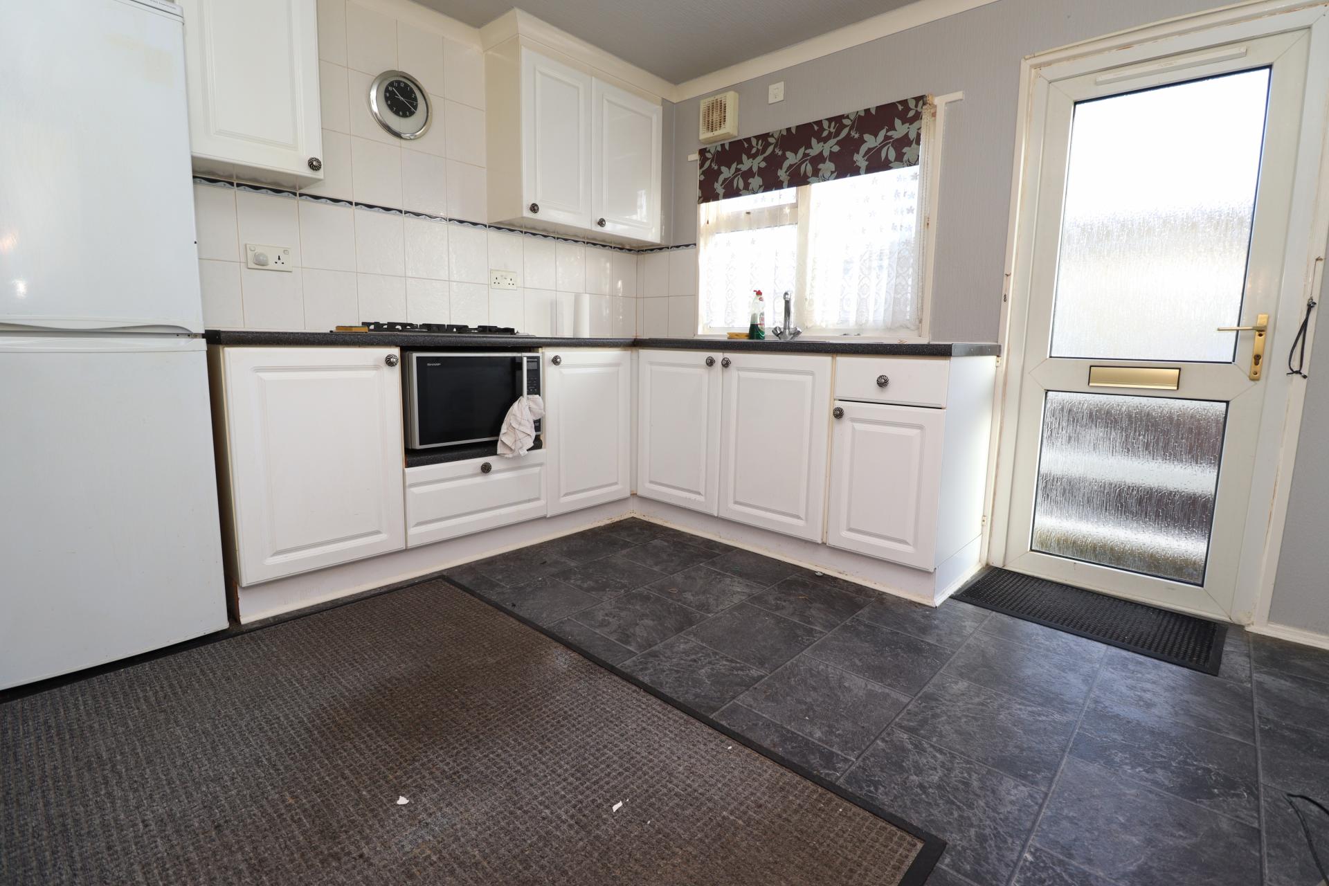 KITCHEN 12' 8" x 9' 3" (3.88m x 2.83m) Fitted with a range of wall and base units with work surfaces over, stainless steel sink with side drainer and mixer tap over, gas hob, spaces for fridge and washing machine, cupboard housing the gas fired central heating boiler, tiled splashbacks, radiator, double glazed window and door to the side aspect.