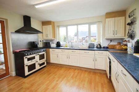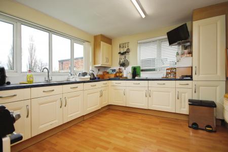 KITCHEN 12' 5" x 10' 5" (3.81m x 3.19m) Fitted with a range of wall and base units with work surfaces over, stainless steel 1 1/2 sink with twin drainer and mixer tap over, integrated fridge, freezer and washing machine, space for Range cooker, wall mounted gas fired central heating boiler, tiled splashbacks, laminate flooring, radiator and double glazed windows to the side and rear aspects.