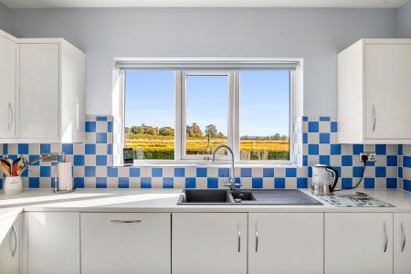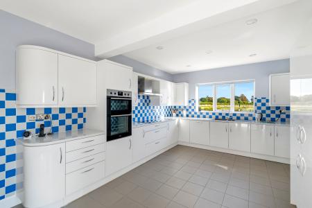 KITCHEN 19' 9" x 11' 6" (6.02m x 3.51m) With UPVC double glazed window and double external doors, tiled flooring, and fitted with a range of wall, base units and drawers with quartz work surfaces and tiled splashbacks, integrated double oven, four-ring ceramic hob with extractor over, composite sink drainer with Clearwater tap, integrated dishwasher and radiator.