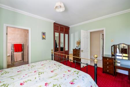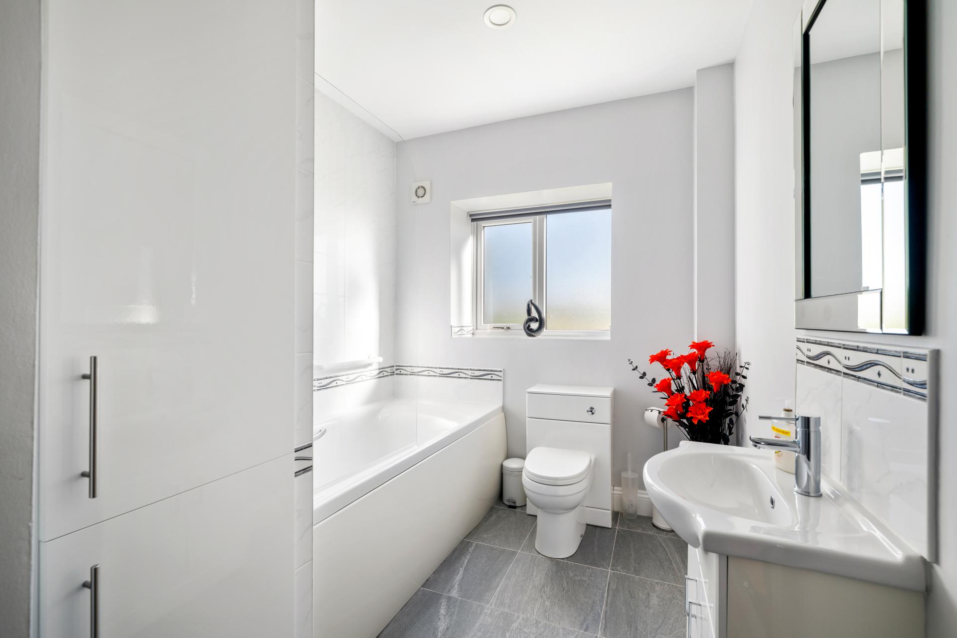 EN-SUITE 9' 4" x 8' 6" (2.84m x 2.59m) With UPVC double glazed window, tiled flooring, fully tiled walls, low level WC, wash hand basin with cupboard below, bath with tiled surround, walk-in shower with drain, heated towel rail, and extractor fan.