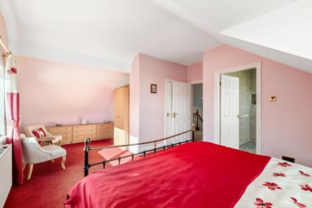 EN-SUITE 9' 0" x 4' 10" (2.74m x 1.47m) With UPVC double glazed window, tiled flooring, low level WC, wash hand basin, walk-in shower with tiled surround and drain, heated towel rail, and extractor fan.