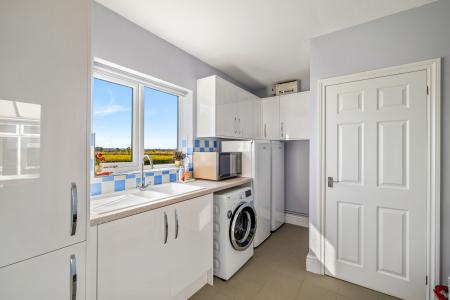 UTILITY ROOM 12' 7" x 9' 0" (3.84m x 2.74m) With UPVC double glazed window and external door, tiled flooring, base units with work surface and tiled splashbacks, composite sink drainer, plumbing and space for washing machine, spaces for fridge and freezer, wall-mounted unit housing the oil-fired boiler and radiator.