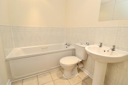 BATHROOM Fitted with a three piece suite comprising of panelled bath, pedestal wash hand basin and close coupled WC, part tiled walls, spotlights and radiator.