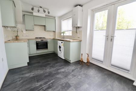 KITCHEN/DINER 15' 5" x 8' 3" (4.71m x 2.52m) Fitted with a range of wall and base units with work surfaces over, stainless steel 1½ bowl sink with side drainer and mixer tap over, electric oven with gas hob, spaces for fridge freezer and washing machine, tiled splashbacks, radiator, wall mounted gas fired central heating boiler, double glazed window to the rear aspect and double glazed French doors to the rear garden.