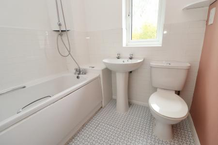 BATHROOM Fitted with a three piece suite comprising of panelled bath with shower over, close coupled WC and pedestal wash hand basin, tiled splashbacks, radiator and double glazed window to the rear aspect.