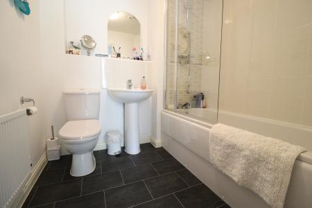 BATHROOM 6' 2" x 6' 8" (1.90m x 2.04m) , with tiled flooring, partly tiled walls, suite to comprise of bath with shower over, WC and wash hand basin and radiator.