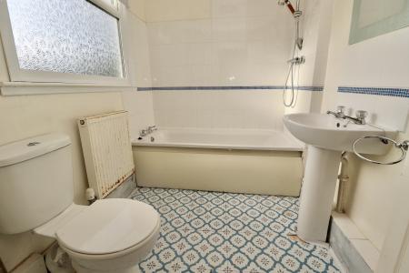 BATHROOM Fitted with a three piece suite comprising of panelled bath with shower over, pedestal wash hand basin and close coupled WC, tiled splashbacks, wall mounted gas fired central heating boiler, radiator, space for washing machine and double glazed window to the side aspect.
