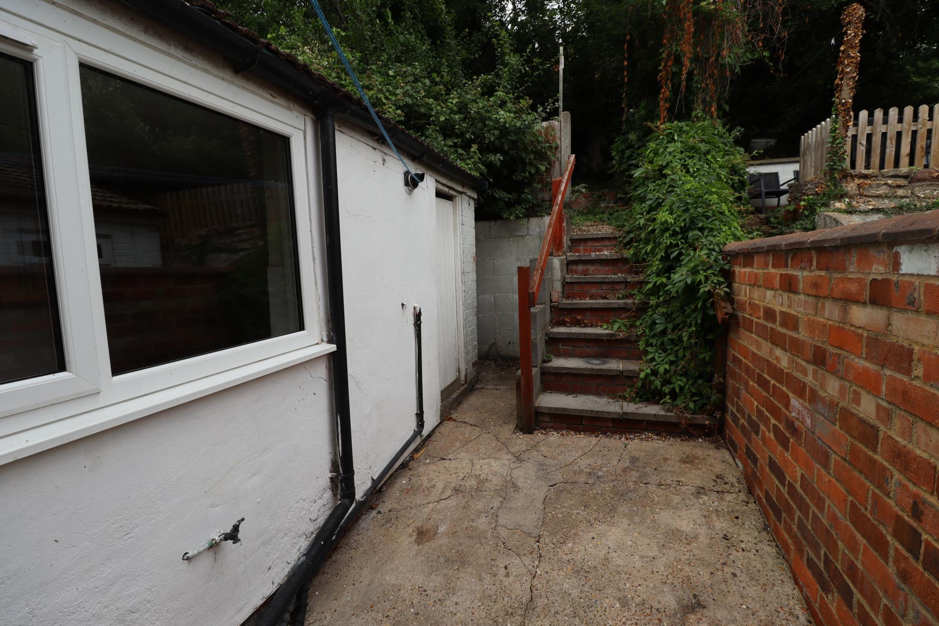 OUTSIDE To the front of the property there is a small courtyard garden with a shared passageway to the rear. To the rear there is a yard, outbuilding, steps up to a terrace garden with a range of different levels and mature shrubs and trees.