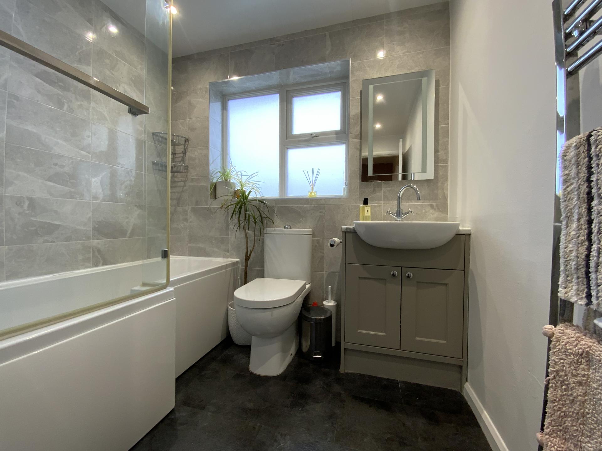 BATHROOM 5' 5" x 7' 2" (1.65m x 2.18m) With UPVC window to the front aspect, laminate flooring, partly tiled walls, chrome towel radiator, bath with shower over, WC and wash hand basin with vanity cupboard and airing cupboard with shelving.