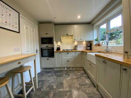 KITCHEN 9' 3" x 9' 0" (2.82m x 2.74m) With tiled flooring, UPVC window overlooking the rear garden, fitted with a range of modern wall, base units and drawers with wooden work surfaces over, complementary splashbacks, integral dishwasher, integral Belfast sink with mixer tap over, integral Neff four ring gas hob with extractor over, integral Beko oven and grill, integral microwave oven, floor mounted electric fan heater, concealed gas central heating boiler, LED spotlights to ceiling and archway leading into the Utility Room.