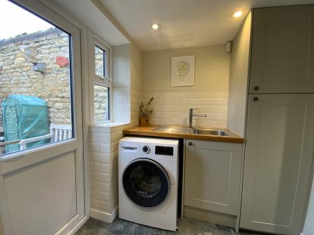 UTILITY ROOM 5' 9" x 7' 5" (1.75m x 2.26m) With UPVC window and door to the rear garden, tiled flooring, feature vertical towel radiator, fitted with a range of base units with work surfaces over, stainless steel sink and drainer with mixer tap over, full height storage cupboard, space for washing machine, partly tiled walls, LED spotlights to the ceiling, space for a fridge freezer and door to the Shower Room.