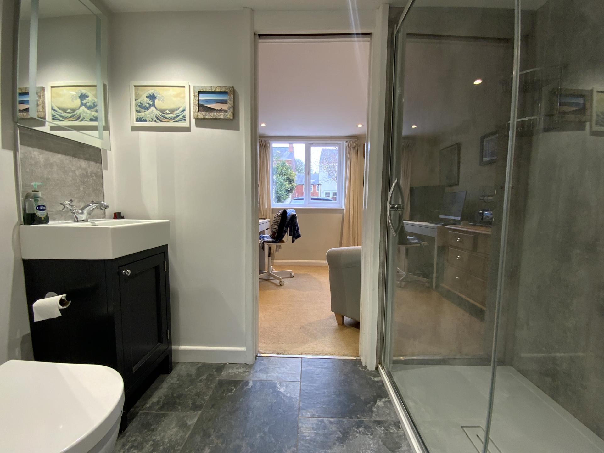 SHOWER ROOM With tiled flooring, suite to comprise of WC, wash hand basin with vanity unit and shower cubicle with mermaid boarding, LED spotlights to the ceiling and feature vertical towel radiator.