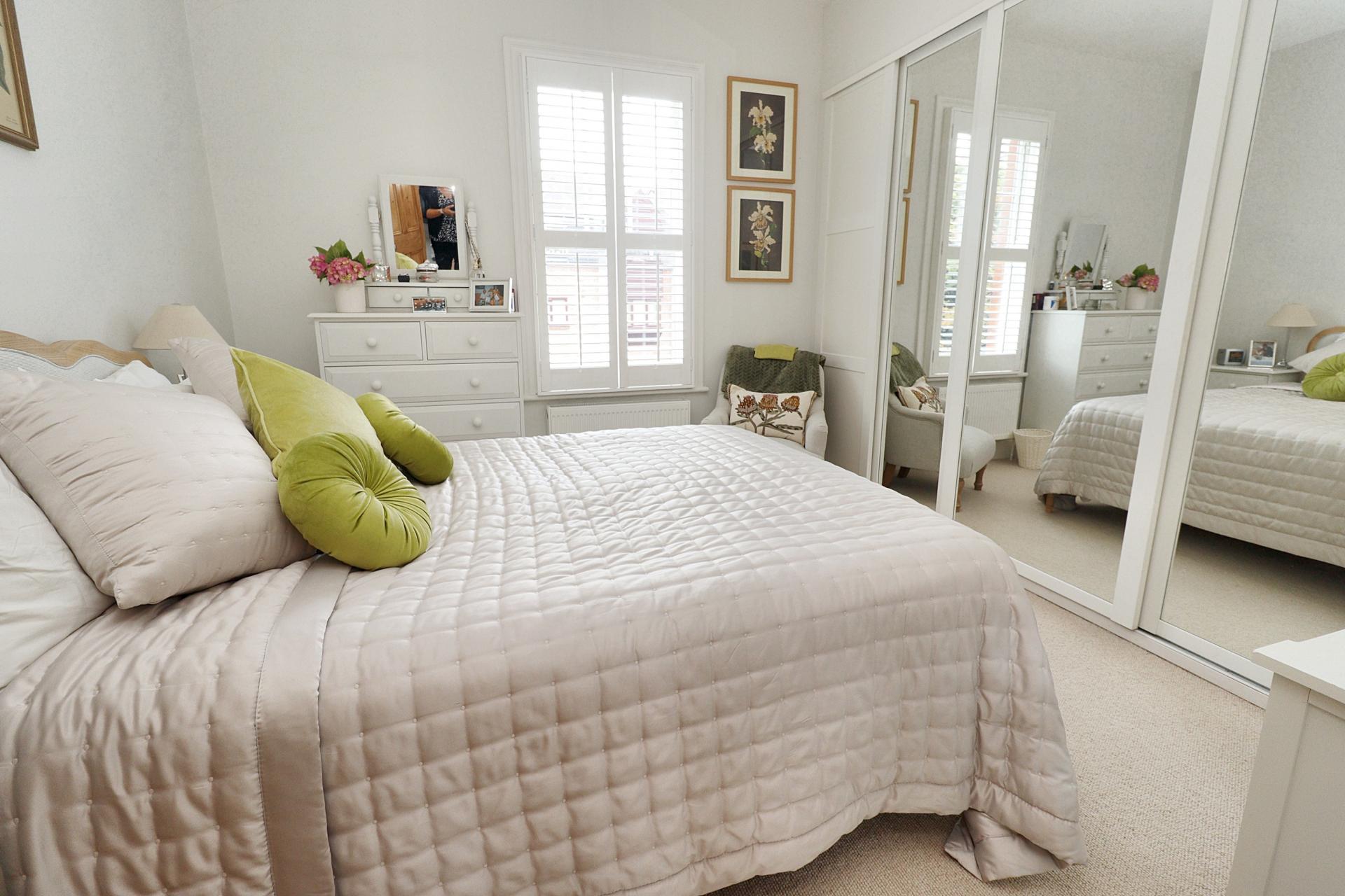 BEDROOM 1 10' 9" x 10' 3" (3.28m x 3.12m) , with double glazed window to the front aspect with wooden shutters, built-in wardrobes with mirror fronted sliding doors, spotlights and radiator.