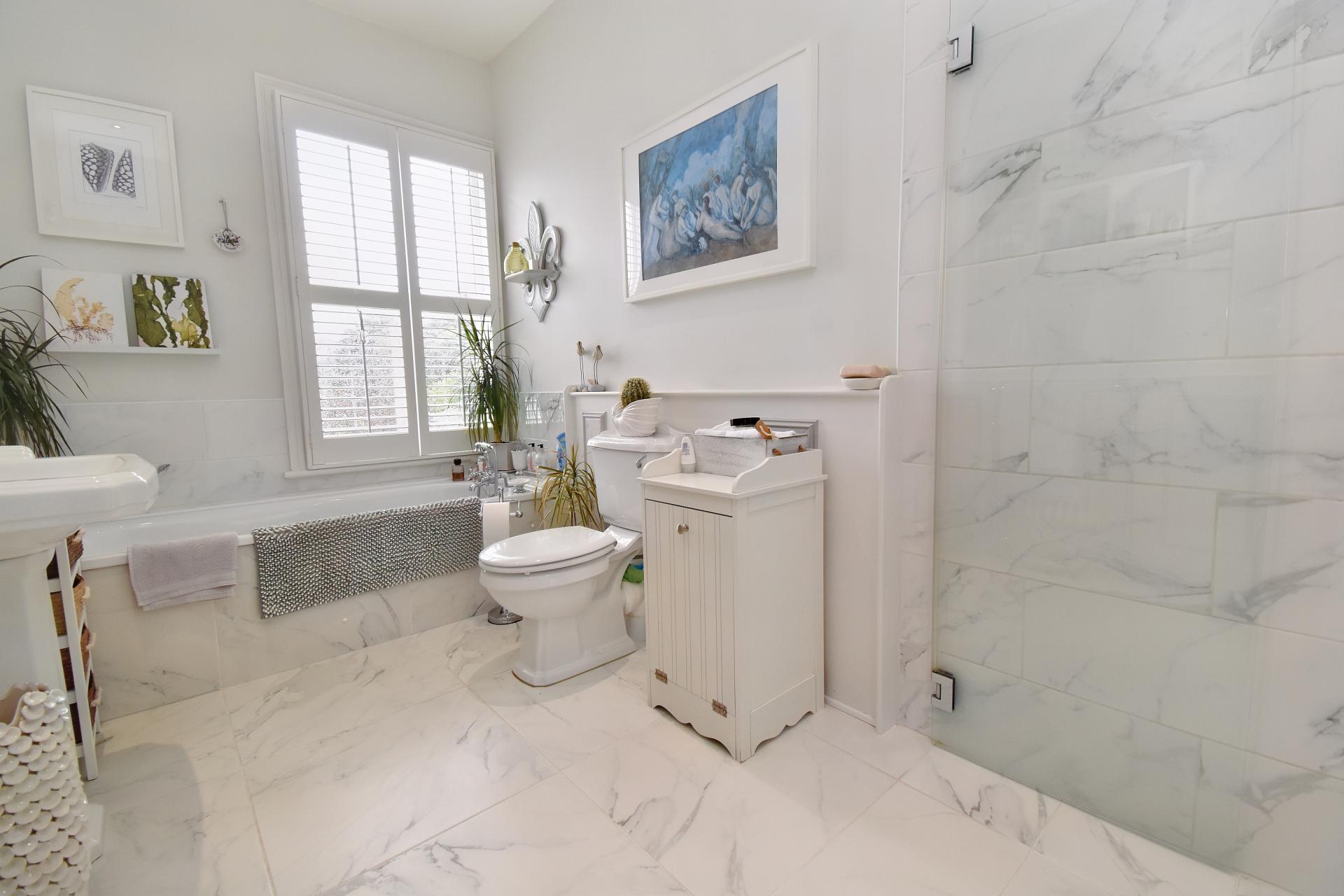 BATHROOM 11' 10" x 6' 9" (3.61m x 2.06m) , fitted with a four piece bathroom suite comprising of panelled bath with hot and cold mixer tap and shower attachment, pedestal wash hand basin with hot and cold taps, close coupled WC and shower wet room area with rainfall shower and fold away glass shower screens, tiled flooring, part-tiled walls, spotlights, radiator and double glazed window to the rear aspect.