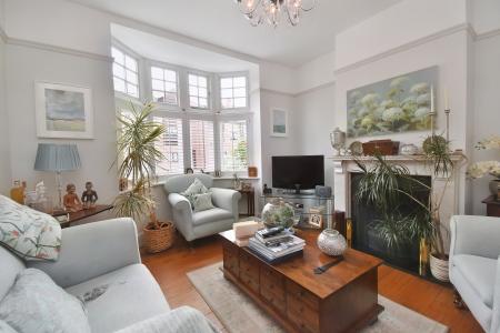 LOUNGE 11' 4" x 10' 10" (3.45m x 3.3m) , with double glazed bay window to the front aspect with wooden shutters, open cast iron fireplace in a feature fireplace, engineered hardwood flooring with underfloor heating and picture rail.
