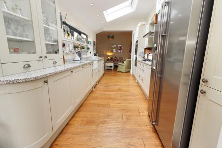 KITCHEN 16' 10" x 8' 6" (5.13m x 2.59m) , fitted with a stylish range of wall and base units with marble worktops over, Belfast sink with mixer tap over, integrated dishwasher, washing machine, eye-level electric oven and grill, five ring gas hob with extractor fan over, space for American fridge freezer, double glazed window to the side aspect, three Velux windows, spotlights and engineered hardwood flooring with underfloor heating.
