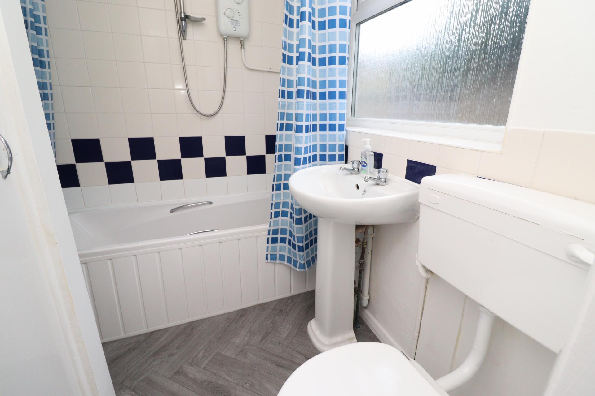 BATHROOM Fitted with a three piece suite comprising of panelled bath with electric shower over, pedestal wash hand basin and close coupled WC, airing cupboard, towel radiator, tiled splashbacks and double glazed window to the side aspect.