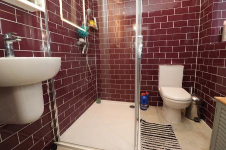 SHOWER ROOM Fitted with a three piece suite comprising of shower cubicle, close coupled WC and wall mounted wash hand basin, tiled walls, tiled flooring, towel radiator and double glazed window to the side aspect.