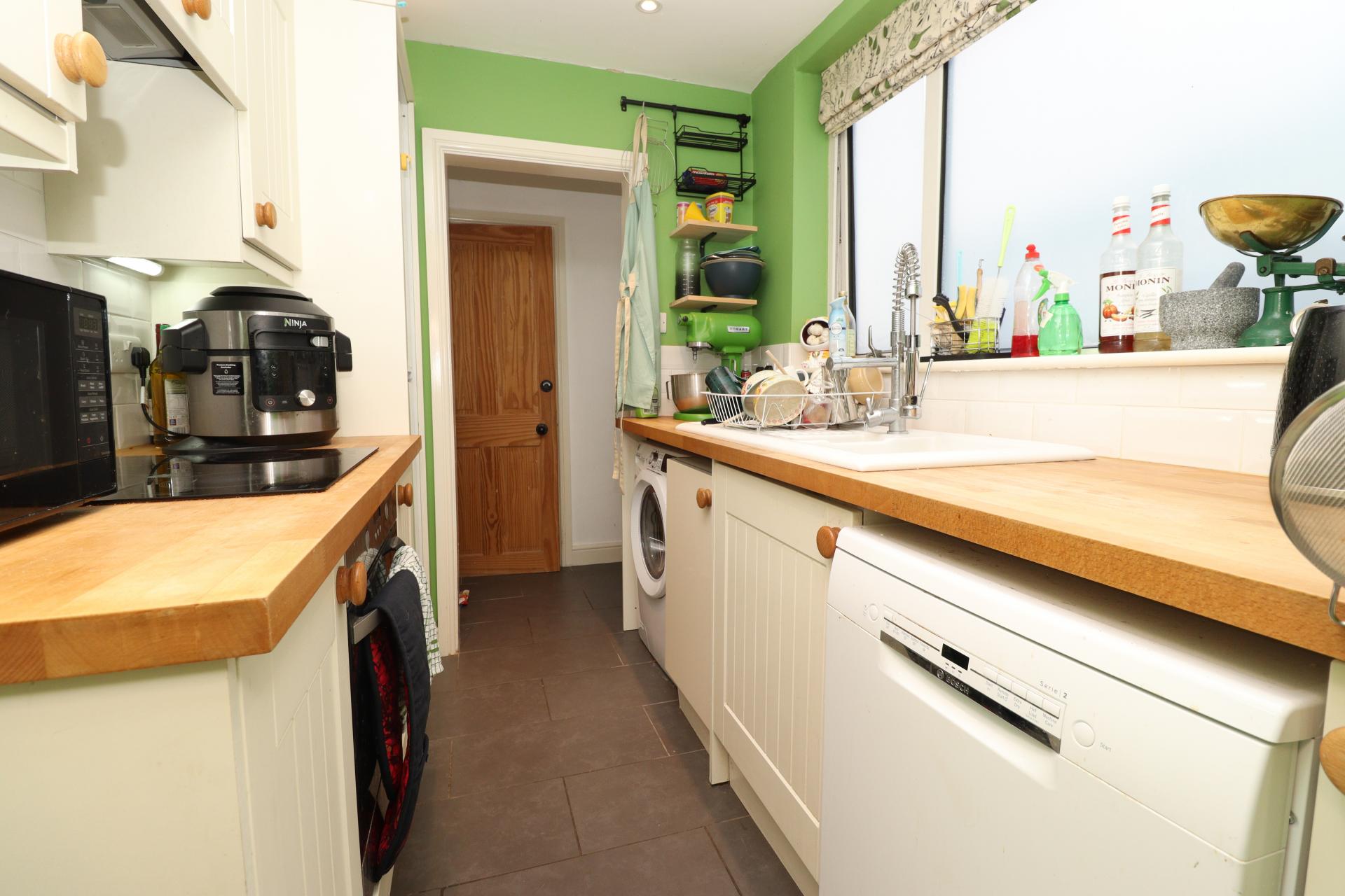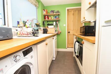 KITCHEN 8' 7" x 6' 5" (2.62m x 1.96m) Fitted with a range of wall and base units with work surfaces over, ceramic 1 1/2 bowl sink with side drainer and mixer tap over, electric oven and hob with extractor fan, spaces for fridge freezer, washing machine and dishwasher, tiled splashbacks, tiled flooring, spotlights and double glazed window to the side aspect.