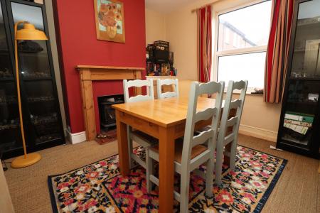 DINING ROOM 12' 2" x 12' 2" (3.71m x 3.71m) With double glazed window to the rear aspect, understairs storage cupboard, double height stripped pine cupboard, decorative fireplace, tiled flooring and radiator.